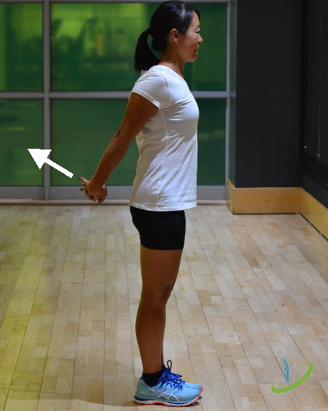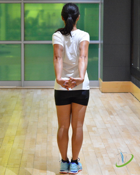 1.) Stand up straight and interlock your fingers together, behind your back and keep your arms straight (as in figure one).
