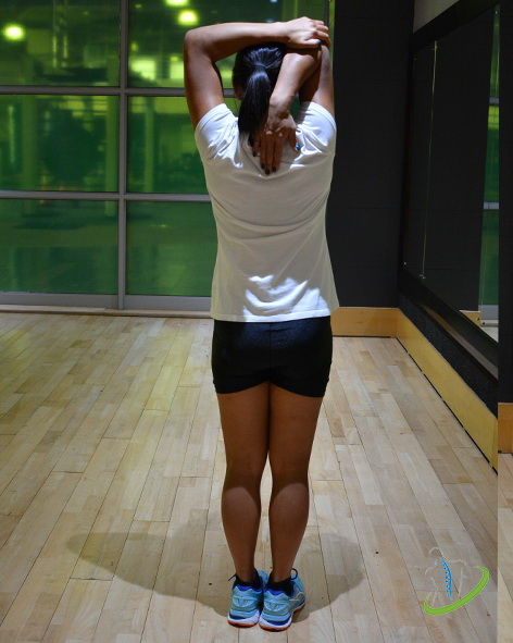 4.) With the left hand on the right elbow, push the arm downwards.
